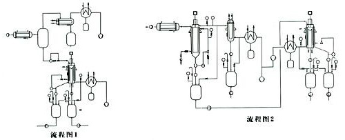 大量的低沸物在刮膜蒸發(fā)器里被除去,產(chǎn)品的蒸餾在后級的短程蒸餾器里產(chǎn)生(流程圖2)。